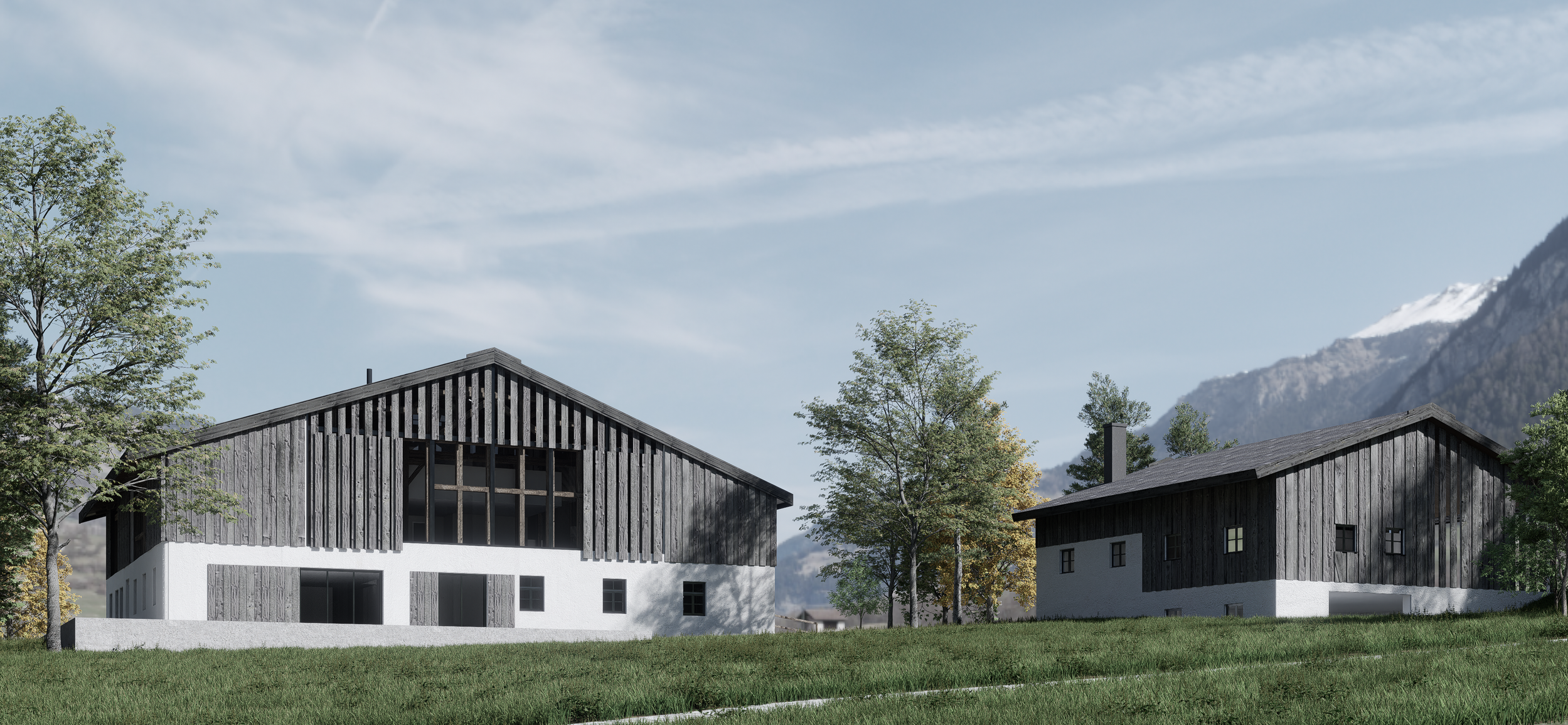 Das Projekt umfasst die Sanierung und den Umbau eines denkmalgeschützten Bauernhauses mit Wohnhaus, Stall und Tenne, sowie den Neubau einer Scheune mit Tiefgarage an der Stelle des ehemaligen Nebenhauses. Der zweigeschossige Massivbau aus dem 19. Jahrhundert bleibt in seiner historischen Substanz weitgehend erhalten, während die Anbauten modern nutzbar gemacht werden. Ziel ist es, die ursprüngliche Architektur und Atmosphäre zu bewahren und gleichzeitig zeitgemäßen Wohnraum zu schaffen.